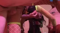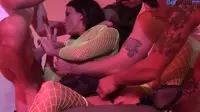 In an intense and passion-filled scene, a stunning brunette with massive tits and round ass takes center stage as the insatiable whore amidst a thrilling orgy of hard cocks, eager to please a group of dominant men.The room fills with the pulsating beats of carnal desire as this vivacious lady bends over, her succulent cunt ready for penetration.As her ass quivers in anticipation, she looks up and catches eyes with each man, inviting their strong, muscular bodies to join her on a journey towards ecstasy.The first man steps forward, his thick cock pulsing with intent, as the whore engulfs him deeply in a throat-gagging blowjob, relishing the taste of hot and salty cum.The sight and sound of her moaning drive the others to take their turn, one after another, as each eagerly fucks her from behind or between her legs.In a raunchy display, her face and mouth are covered in an erotic mixture of sweat, saliva, and man juices, as each participant enjoys her services.As the orgy reaches its fever pitch, the insatiable whore becomes the center of a blowbang scene, where multiple men simultaneously fuck her face in a cocksucking frenzy that leaves her gasping for air.As the room fills with the cacophonous sounds of ecstatic grunts and moans, this incredible woman finds herself at the heart of an intense four-way DP experience, where two men take turns stretching her ass while another slides his cock deep inside her cunt.The pleasure she experiences sends waves of climactic orgasms coursing through her entire body.In a kinky twist, her clit receives attention as the remaining guy plays with it gently using his fingers, sending shockwaves of ecstatic shudders up her spine and causing her to lose herself in a mind-blowing pleasure.The men hold onto one another for support as they climax together, their hot cum covering the whore's face and body while she revels in the overwhelming pleasure that engulfs her entire being.Amidst this passionate display, the crowd of voyeuristic onlookers watches in awe, eager to take part in any capacity as they anticipate what may come next.The energy and excitement build, with the potential for more intense anal play and oral satisfaction looming in the air, leaving everyone wanting more.